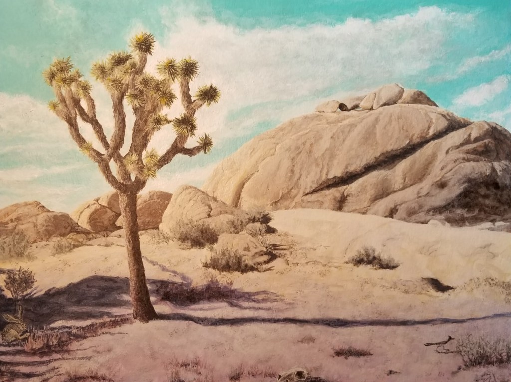 But so are plants. Frustrated by trying to capture a desert scene, I looked up tumbleweeds. The most common is Russian thistle. I read about various species of tumbleweeds the world over. Most are considered invasive. Why? What can be more enthralling than a nomadic plant? Yet it’s impossible to depict a moving weed in paint. I switched my subject to a roadrunner. A running bird denotes movement in the arid stillness of a painting, where only film can catch a tumbleweed.