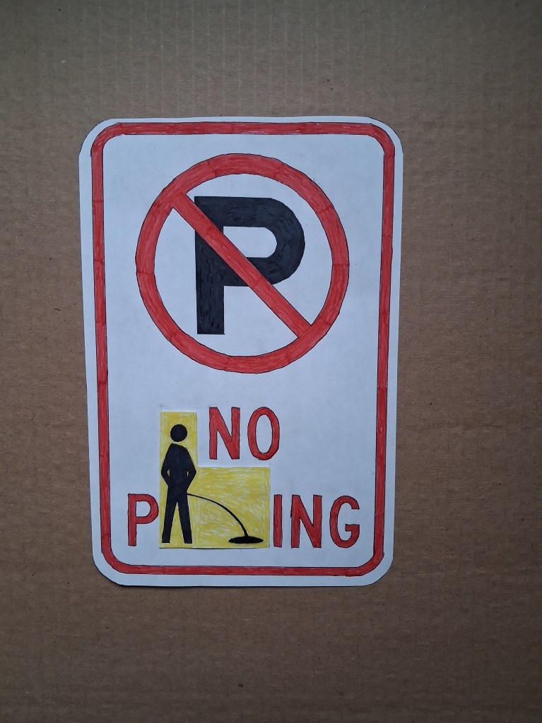 On those hot summer days the asphalt cooked its territorial markings to a new threat level. Anyone would figure this to be the site of a pissing contest. One slow afternoon everyone got fed up. An idea occurred to nobody, an attempt to combat the displeasure of this little reeking stretch of macadam. The sign on the pillar stated: